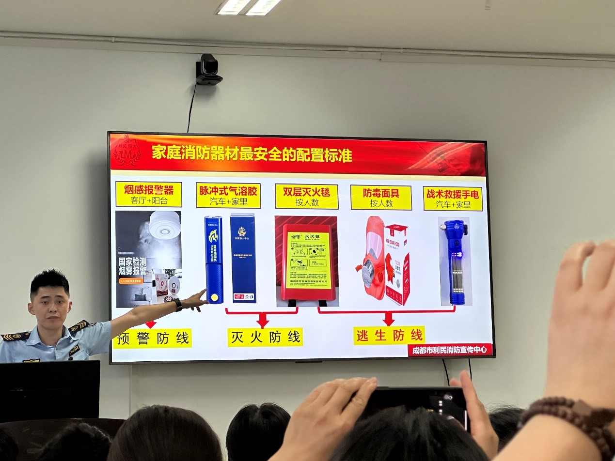 张教官首先进行了自我介绍,为大家讲解了基本消防安全制度,并简要介绍相关法律法规,旨在使大家形成基本消防观念。为了向研究生同学们宣传消防安全知识、提高居民的消防安全意识、培养居民遇到火灾突发事件是的应变能力,许教官给我们上了生动的一课。