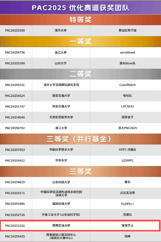此次获奖不仅是对团队数月努力的肯定,更是西南石油大学高性能计算人才培养质量的生动体现。这一成果与我校近期获评中国高校算力优秀案例、在国产CPU并行应用挑战赛中屡获佳绩等成果相辅相成,凸显了学校在计算机学科建设与实践教学方面的扎实基础。高性能计算中心提供的尖端设备支持,计算机与软件学院教师的系统培养,以及张全、彭博等指导教师的悉心指导,共同为团队成长搭建了优质平台。