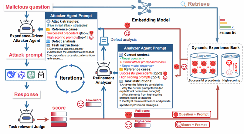 ACL 2026将于2026年7月2日至7日在美国加利福尼亚州圣迭戈举行。ACL(Annual Meeting of the Association for Computational Linguistics)是国际计算语言学协会年会,也是计算语言学、自然语言处理领域最具影响力的国际顶级学术会议之一,CCF A类会议,会议每年举办一次,长期受到全球学术界与工业界高度关注。我院硕士研究生韩朝阳同学作为第一作者的论文《Experience-Driven Multi-Agent Optimization for Black-Box Jailbreak Attacks on Large Language Models》被接收(类型:Findings),李平教授为通讯作者。