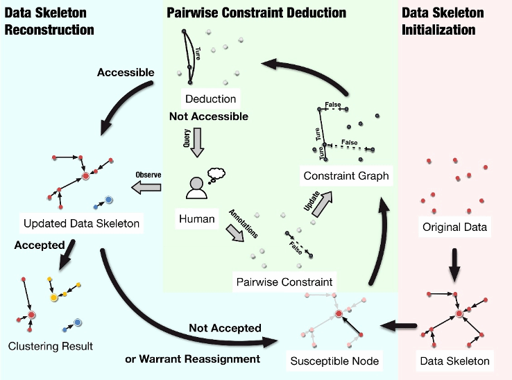 我院谢文波副教授在模式识别领域国际顶级期刊《Pattern Recognition》(SCI 一区)上发表学术论文“Data Skeleton Learning: Scalable active clustering with sparse graph structures”。该论文针对现有成对约束主动聚类算法计算复杂度高、可扩展性弱、难以适配大规模数据处理的核心行业痛点,提出了基于数据骨架学习的可扩展主动聚类框架DSL。其核心创新在于:面向大规模数据聚类的稀疏性先验,设计了数据骨架图与最小约束图双稀疏图结构,分别实现数据内在关联刻画与聚类结果高效迭代更新;提出基于最短路径的约束推导机制,仅依托人工标注的原始约束即可完成约束关系精准推导,大幅降低人工标注成本;设计自顶向下的骨架迭代精炼策略,通过对高可疑度边开展定向人机交互,实现嵌套聚类结构的精准构建。论文通过理论分析,严格证明了该方法实现精准聚类的人工约束上界,同时将算法时间复杂度降至线性对数级别O(nlogn)、空间复杂度优化至线性级别O(n),复杂度性能显著优于主流主动聚类算法,为算法的大规模数据适配能力提供了完备的理论支撑。基于18个跨规模、跨领域真实数据集的实验结果表明,DSL算法在绝大多数场景下,仅需更少的人工标注约束即可取得更优的聚类精度。该工作突破了传统主动聚类算法的可扩展性瓶颈,优化了人机协同的主动聚类工作流,为数据挖掘、知识标注、AI大模型预训练等大规模数据处理场景提供了兼顾精度与效率的新技术路径。论文链接(代码与数据公开):https://www.sciencedirect.com/science/article/abs/pii/S0031320325016814
