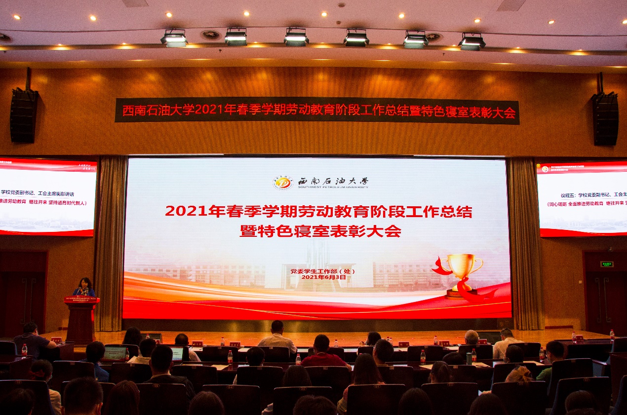6月3日,西南石油大学2021年春季学期劳动教育阶段工作总结暨特色寝室表彰大会在图书馆学术报告厅顺利召开。学校党委副书记、工会主席衡彤,党委学生工作部、团委、教务处、研究生院、招生就业处、大学生创新创业中心、图书馆、工程训练中心、后勤服务总公司负责人,各学院党委副书记(学生工作负责人),全体专兼职辅导员,研究生及本科生代表出席会议。会议由党委学生工作部(处)副部(处)长陈俐宏主持。