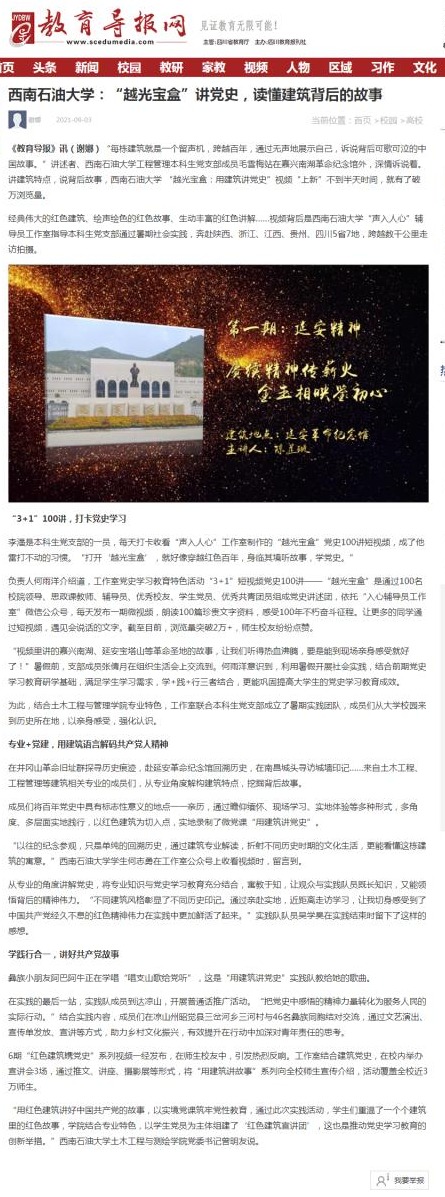 “用红色建筑讲好中国共产党的故事,以实境党课筑牢党性教育,通过此次实践活动,学生们重温了一个个建筑里的红色故事,学院结合专业特色,以学生党员为主体组建了‘红色建筑宣讲团’,这也是推动党史学习教育的创新举措。”西南石油大学土木工程与测绘学院党委书记曾明友说。