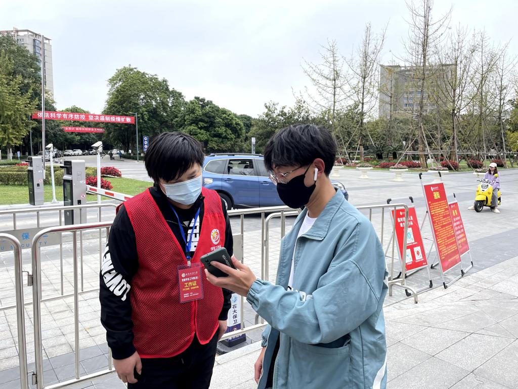 保卫工作人员引导学生出示证件、扫描场所码进校