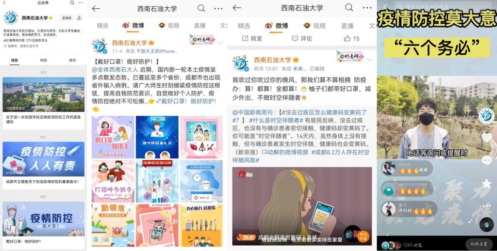 党委宣传部统筹抓好全校疫情防控新闻宣传、舆论引导等各项工作,广播站实施疫情应急值班制度。通过视频、图文等形式在微博、微信、抖音、快手、网站等学校官方媒体平台上,持续推送疫情防控工作要求和疫情防护知识等,引导广大师生自觉遵守疫情防控要求,做好个人防护,形成多形式、全时段、全覆盖的宣传引导态势,凝聚起战“疫”正能量。(资料由各单位各学院提供)