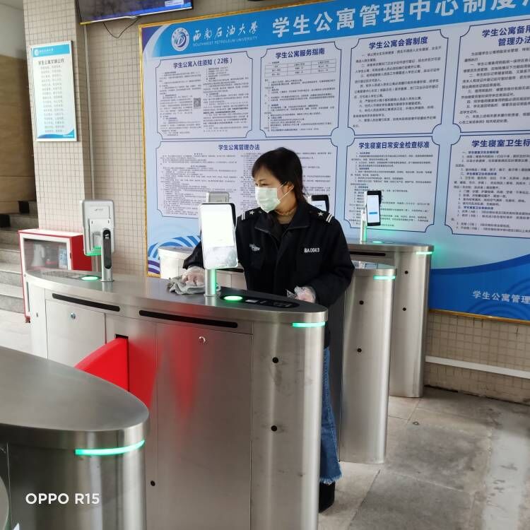 疫情就是命令,防控就是责任。后勤服务总公司严格执行24小时门岗管理,重点做好教工小区西小门、科技园区门禁管理,所有人员进校时必须经过校园一卡通身份核验、健康码核查、场所码核查(核验)和体温检测全覆盖。杜绝校外无关人员和非绿码者进入校园。严格管理所辖职工及合作商家的健康码、体温检测工作,严格做好人员排查、门岗管理和请销假制度,严格做实个人防护举措,非必要不离蓉。餐饮中心对所有食堂加强消毒,实行“一米线”距离排队,加强对冷冻食品的安全管理,对食堂供应商家严格执行佩戴口罩、查看健康码。学管中心加大公共区域消毒力度、门禁管理和宿管人员检查力度,一旦发现发热、干咳、乏力等症状的同学,第一时间进行通报。绿化环卫中心召开疫情防控紧急会议,安排部署校园杀毒灭菌工作,做好人员健康监控与排查,建好每日监管台账。物管中心加大小西门的管理,坚决做到亮码、亮卡、测体温。