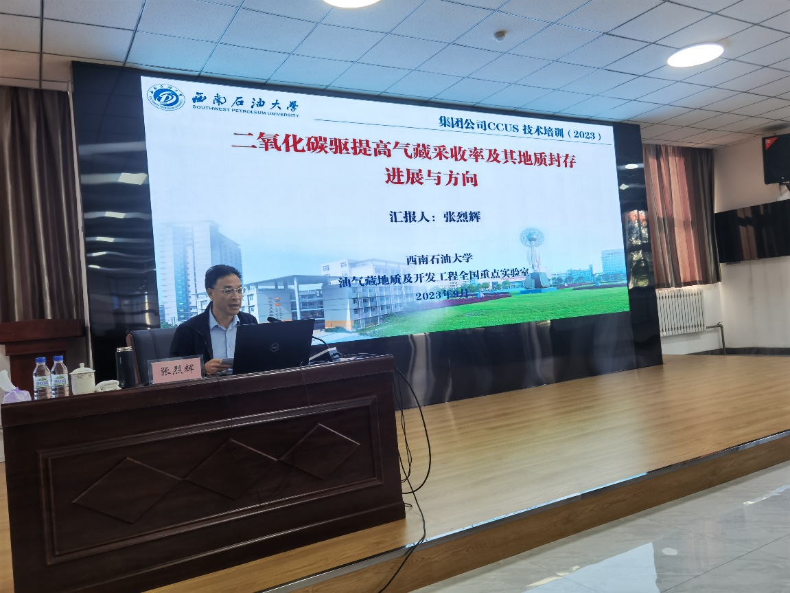 为全面贯彻落实国家“双碳”战略,大力推广CCUS实践应用,为中国石油实现绿色低碳转型发展提供技术支持和人才保障,中国石油集团公司(以下简称“中国石油”)首次举行了CCUS技术培训班。中国石油将此次培训列为重点培训项目,精心设置课程模块,邀请了院士、石油高校学者和多位油气田企业的专家进行授课并开展专题研讨。培训于9月11日开班,历时13天。9月23日,在吉林油田举行结业仪式。吉林油田公司执行董事、党委书记王峰,中国石油高级专家廖广志,石油工业出版社总经理李俊军等领导和来自高校和中国石油相关单位的领导、专家以及培训班学员参加。我校党委副书记、校长张烈辉应邀出席结业仪式,为培训班授课,并为CCUS技术系列丛书揭幕。
