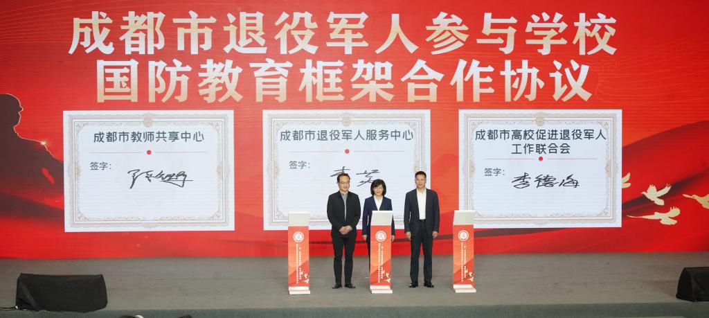李德海代表联合会发言。他介绍了联合会筹备历程、西南石油大学退伍大学生培养等工作,并代表联合会与成都市烈士纪念设施保护中心签订红色教育资源基地合作协议,与成都市教师共享中心、成都市退役军人服务中心签订成都市退役军人参与学校国防教育框架合作协议。
