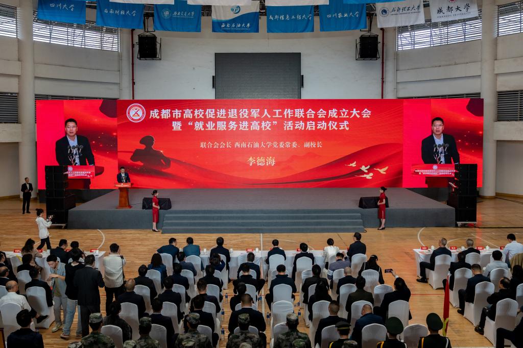 11月7日,成都市高校促进退役军人工作联合会(下称“联合会”)成立大会暨“就业服务进高校”活动启动仪式举行。省市退役军人工作机构相关领导,四川大学、西南石油大学等42家会员单位相关负责同志出席了会议,成都市各区(市、县)退役军人事务局、部分在蓉高校的大学生及相关媒体代表等共计1200余人参加活动。我校当选联合会理事会会长单位,学校党委常委、副校长李德海当选联合会会长。