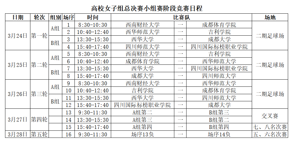 本届联赛总决赛足球项目高校女子组由我校承办,预赛晋级的前8强队伍将在3月24日-28日决出5-8名,1-4名将在总决赛第二阶段决出。
