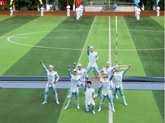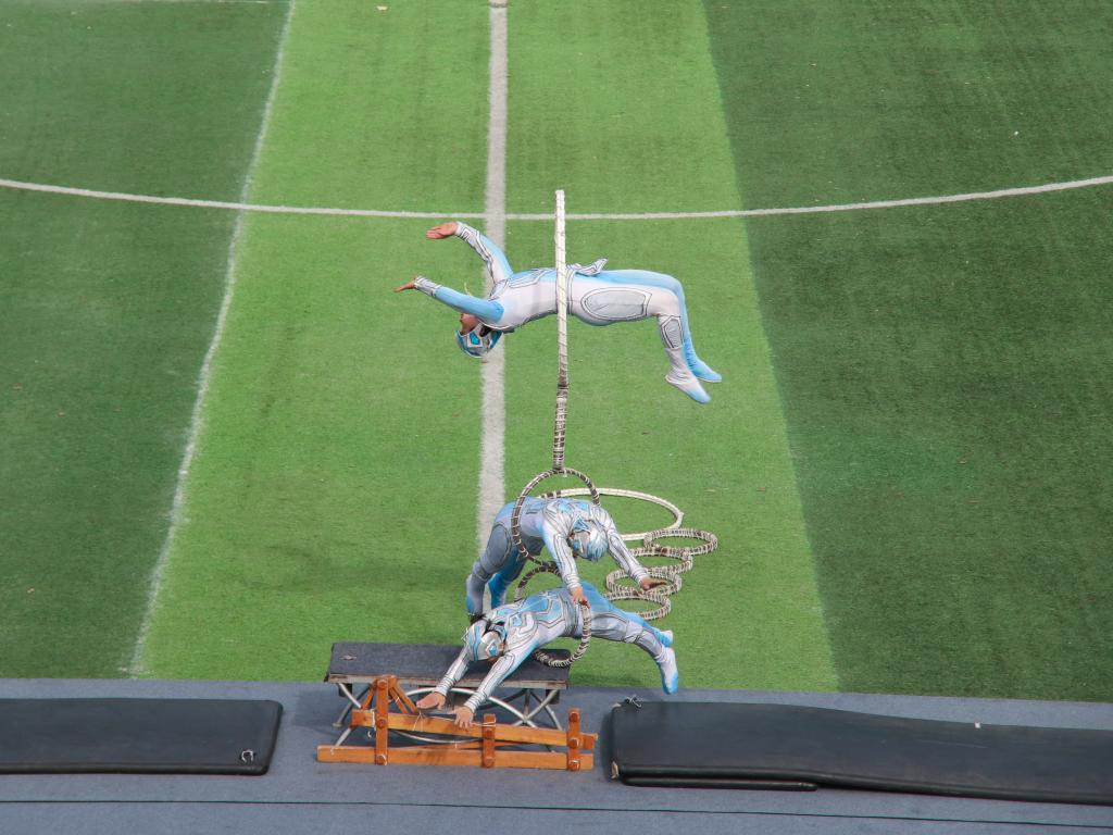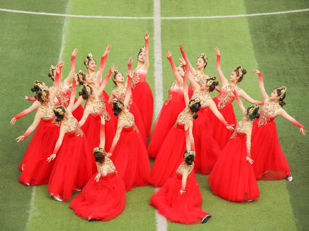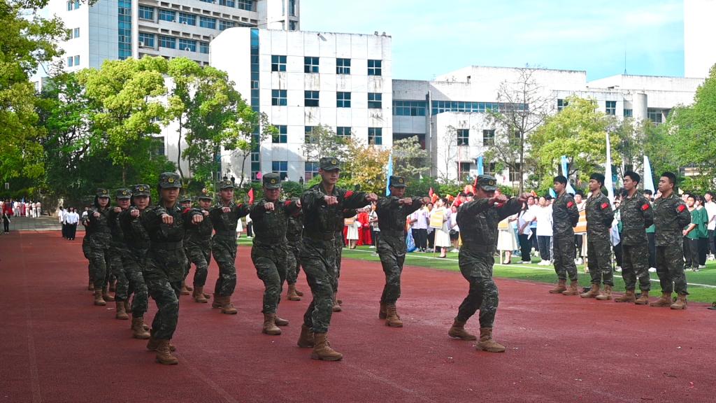 西柚老兵方队表演了倒功、擒拿拳、刺杀操,动作干净利落,一气呵成,彰显出军人的龙虎声威和青年大学生的热血刚毅。由校区优秀中华传统文化传承创新基地带来的戏曲舞蹈《潮起东方》巧妙地将传统戏曲与现代舞蹈融为一体,舞者们身着鲜艳的红衣,在悠扬的音乐声中翩翩起舞,舞姿优美动人。大型综合杂技表演节目《勇士》,将力量与美学完美结合,在叠起的铁圈中穿梭自如,每一次飞跃都让人惊叹不已。