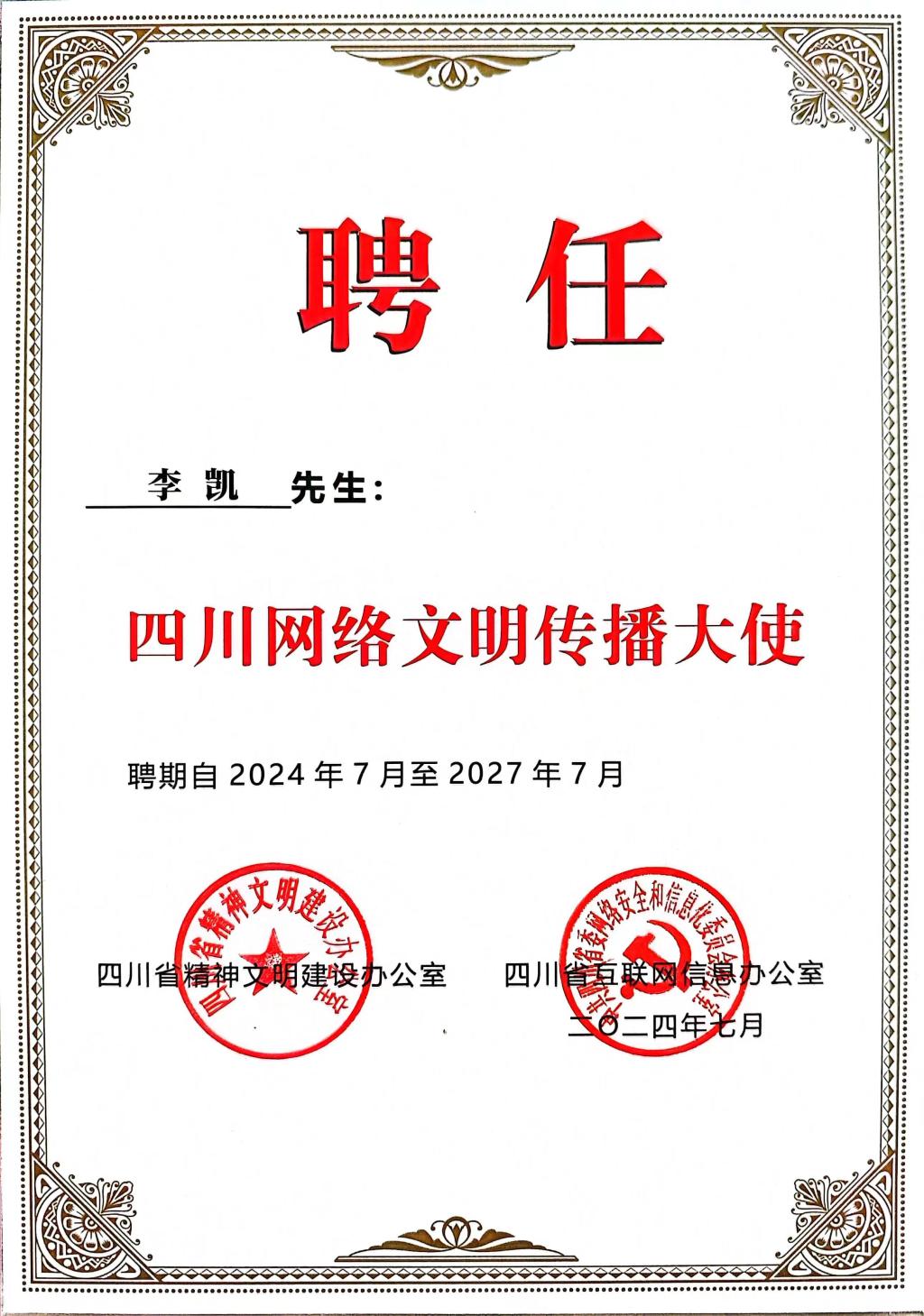 7月26日,“e路川行·文明有我”2024年四川省网络文明主题实践活动启动仪式在新都区新时代文明实践中心举行。活动现场举行了四川网络文明传播大使聘任仪式,全国道德模范提名奖、中国青年五四奖章获得者、我校教师李凯受聘出任四川网络文明传播大使。全省共20人受聘。