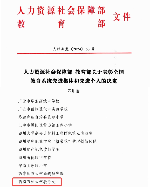 “全国教育系统先进集体”每五年评选一次,是全国教育系统集体最高荣誉。今年6月接到申报通知后,学校党委行政高度重视,学校领导作出专门部署,党委教师工作部牵头开展校内遴选推荐工作,协同拟推荐单位认真准备申报材料。经四川省教育厅评选推荐、全国教育系统评选表彰工作领导小组审核评选,我校教务处荣获“全国教育系统先进集体”称号。四川省属本科高校共有3家单位获得该项荣誉。