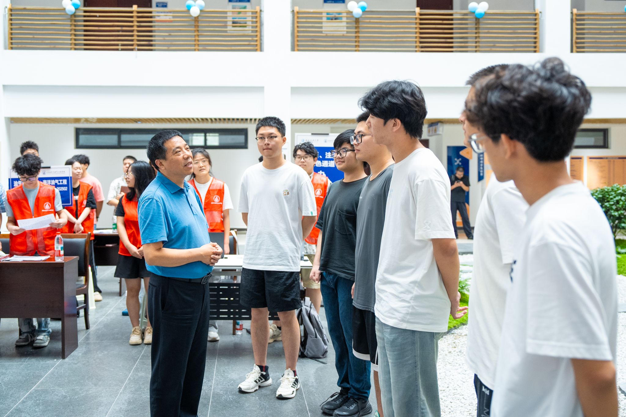 “校长好!我在中学时就把石大作为自己的目标。”石油工程专业新生张校愚分享了入学感受,“今天是圆梦时刻,也是开启新旅程的起点。”油气储运工程专业新生丁鸿凯也介绍了自己“沉浸式”的报到体验:沿着油气开采步骤画成报到路线,走过用新生姓名拼成的迎新墙,再到休息区打卡石油精神文化浮雕……在报到点,他“一站式”体验到浓厚的能源文化。丁鸿凯11岁的弟弟也在不知不觉间被吸引,能源科学的种子悄悄扎根童心,“哥哥的大学太有意思了,我见识了好多厉害的装备,好想快点长大来这里上学!”郭建春对同学们的学习热情表示肯定,并关切询问大家的研究兴趣,给出学习建议:“工科学习不能局限于专业,更要培养跨学科学习能力,希望大家学有所成!”新生刘卿宇的家长也向郭建春讲述了对石大的初印象:“学校很美,求学氛围很棒!”郭建春表示,学校正持续打造优良的学习生活环境,请家长放心,并鼓励新生们尽快融入大学校园,开启学习生活。来到计科院迎新服务点,郭建春看望慰问了参与迎新服务的师生代表,并了解报到情况。“辛苦了,同学们!你们在志愿服务中展现出了石大学子积极昂扬的精神面貌!”