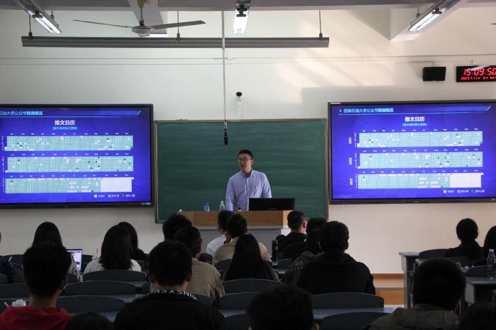 培训邀请到具有丰富媒体从业经历的地科院2021级地质学专业硕士张易主讲。张易聚焦微信公众号“三量”——阅读量、点赞量、在看量,对西南石油大学、成都理工大学和华南师范大学三所大学近三年的官微运营数据进行了详细分析。他介绍,我校与兄弟院校在数据上表现相似,校庆与喜报获奖类文章备受关注,此外,新生入学、军训、毕业典礼等关键词也人气颇高;奖励活动类则在点赞与转发上独具优势。张易认为,要将专业优势与时事热点、生活趣事结合,制作知识科普类文章,采用长图、横图等新颖形式,做到创新且有趣味。要吸取优秀公众号运营经验,在标题上简短有力,善于使用副标题,配图要主体突出、明快淡雅,多采用人物特写,特别注意功能性文章配图的简洁、直观与统一。