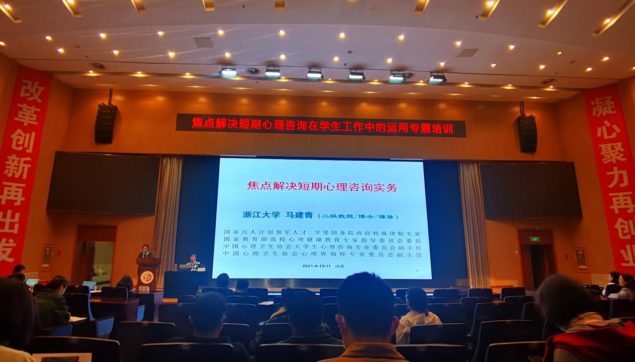 4月10日至11日,浙江大学二级教授马建青应邀在我校开展“焦点解决短期心理咨询在学生工作中的运用”专题培训,来自成都理工大学、遵义医科大学、枣庄学院、成都工业学院、四川护理职业学院等高校200余名老师参加了此次培训。