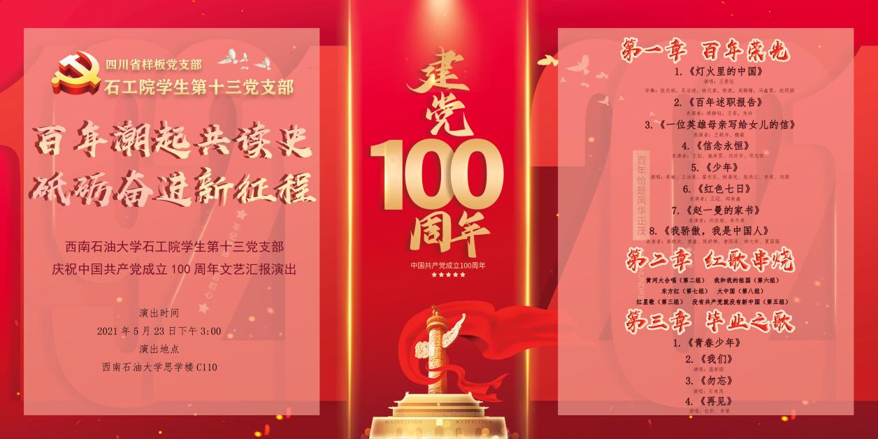 为庆祝中国共产党成立100周年,扎实推进党史学习教育,引导青年学生唱响爱党爱国的时代主旋律,在中国共产党成立100周年之际,石工院学生第十三党支部为中国共产党颂歌...[详细]