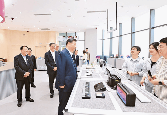 2025年4月29日,中共中央总书记、国家主席、中央军委主席习近平在上海考察。这是习近平在位于徐汇区的上海“模速空间”大模型创新生态社区人工智能产品体验店考察。