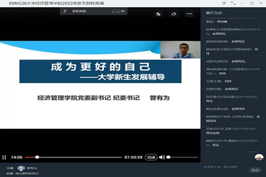 9月19日,经济管理学院举行2022级新生入学教育系列活动之“成为更好的自己——大学新生发展辅导”报告会,报告会由学院党委副书记、纪委书记曾有主讲,全体2022级本科新生通过钉钉直播聆听报告。