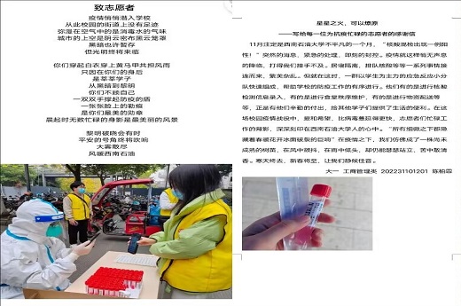 围绕着“封校期间防疫志愿者感悟分享”、“对身边志愿者的赞扬”、“鼓舞大家的抗疫斗志”三方面,同学们集思广益,以图片和文字的形式,抒发了自己对志愿者们的赞美,投递出许多创意十足的作品。经过我院青志协认真评选,最终林佳薇、马小燕、麦尔哈巴·穆合特尔、汪睿倩等同学的作品脱颖而出。其中,会计学2022级黄子峋同学将自己的作品以诗句的形式展示出来,他表示:“黎明破晓会有时,平安的号角终将吹响,大雾散尽,风暖西南石油。”以下为部分优秀作品展示: