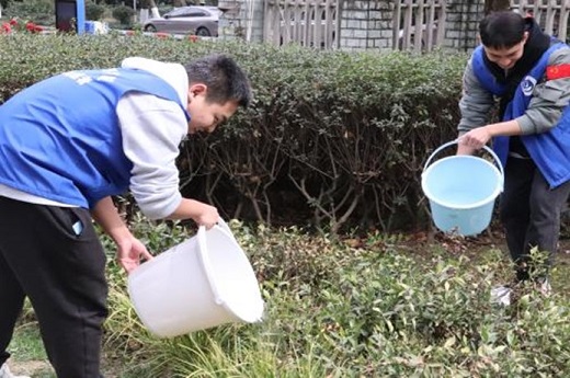 活动现场的同学们热情高涨、干劲十足,在各自负责的劳动区域内对花场环境开展卫生清理工作。他们身着蓝色马甲,满怀劳动热忱,在花场中用铁锹、铁铲等工具修整土地、夯实树苗并拎桶浇水灌溉。活动期间,两个专业的同学一边清扫枯枝落叶、杂草杂物以及花丛中的烟头纸屑,一边交流着关于保护环境的经验看法,现场一片热火朝天。经过1个多小时的劳动,同学们让学校社区环境更添生机,在春日里为校园植下了一抹亮色。