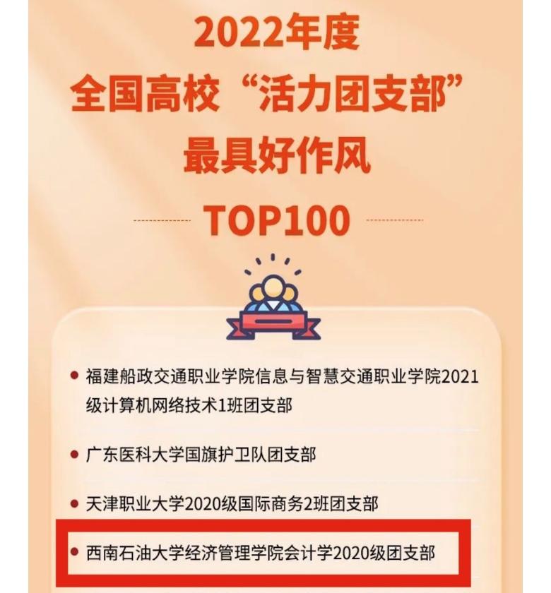 4月23日,中国青年报发布了2022年度全国高校“活力团支部”最具好作风TOP100榜,我校经济管理学院会计学2020级团支部成功入选。