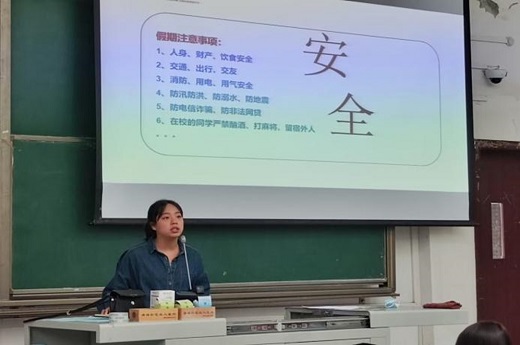 班会上,冉玉嘉老师结合学校相关要求,重点围绕请销假流程、交通安全、出游安全、饮食卫生安全、财产安全、人身安全、自我保护等安全问题进行强化教育。并对在校学生的行为规划提出要求,严禁出现夜不归宿、晚归、晚出等违规行为,并强调了寝室用电安全。
