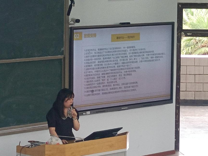首先,李昕露对同学们进行了校规校纪教育和诚信教育。其次,李老师就放假事项和假期相关要求进行通知。随后,李昕露详细讲述了如何制作一份简历,并将简历制作作为同学们暑假作业。同时,李昕露老师通过分析就业现状及前景,建议同学们做好自我职业生涯规划,提早开始准备。最后,李昕露强调了几项重要事项及下学期的重点工作。