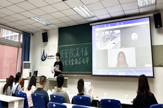 竞选开始,10位竞选人依据抽签顺序依次进入教室内进行自我评述,主要从学生工作经历、岗位理解、未来规划几个部分阐述自身优势。现场老师与同学针对候选人的演讲内容、竞选岗位及过往经历进行提问,竞选人一一回答。