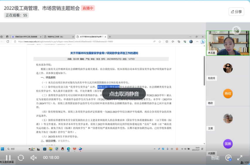 为贯彻落实国家、学校奖助学金资助政策,让同学们更加清晰地了解各项相关工作流程,2022级工商管理、市场营销专业于2023年9月27日晚在飞书会议召开了奖助学金政策宣传解读会。本次班会由辅导员冉玉嘉主持,两专业同学全体参与。