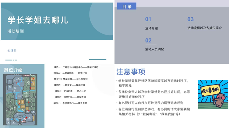 培训开始前,活动负责人将同学进行分组调配,形成带队负责人和摊位负责人两个队伍。培训过程中,主持人介绍本次闯关活动分为七个摊位游戏:情绪红绿灯、自我介绍、花儿与笑容、我画我猜、两人三足、默契考验和校史竞答,接着讲解了活动场地布置、集合时间和地点等有关事宜,最后重点演示了每个摊位的游戏规则:新生们依次进行闯关,闯关成功则在卡片上盖章。