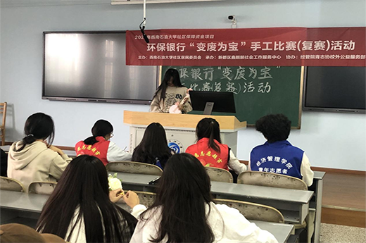 该活动是西南石油大学第十批大学生思想政治教育特色活动:携手共建“环保银行”,搭建志愿服务与劳动教育校园绿色发展平台项目活动内容之一。本次手工比赛活动,既是西南石油大学对于国家绿色发展理念的积极响应,又是石大学子对于保护环境,绿色生活理念的积极践行,相信在我们的未来生活中,绿色环保将真正走入群众心中,成为每一位公民的自觉行动。