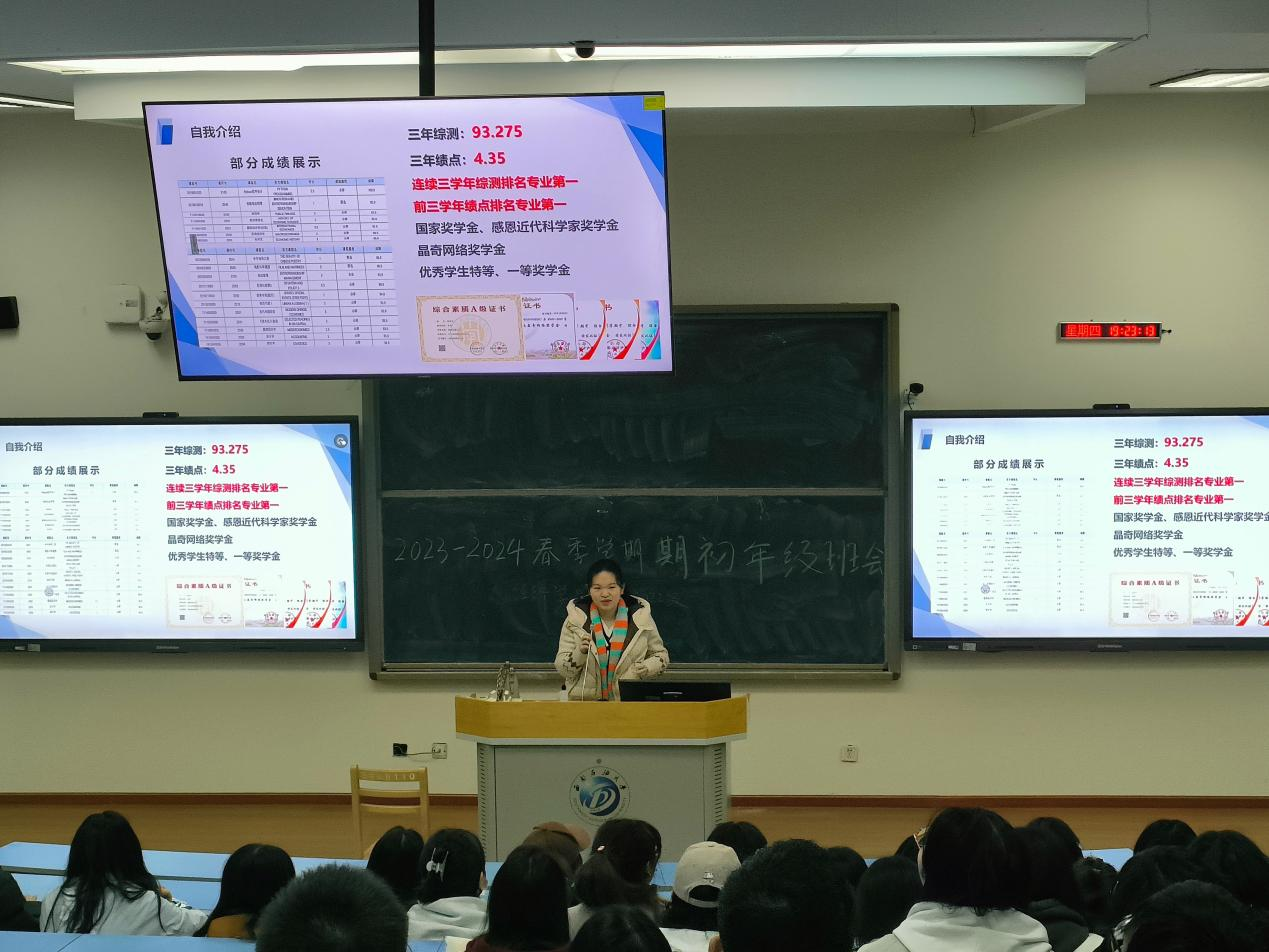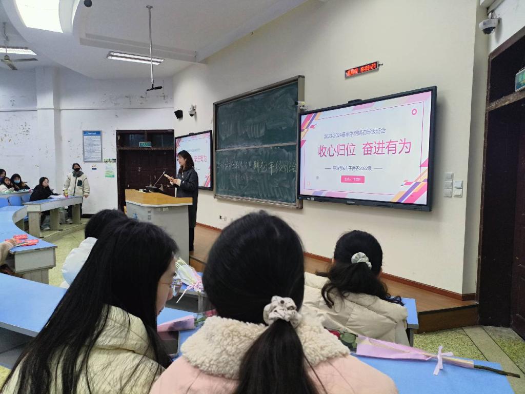 2024年3月7日晚,经济管理学院2022级经济学及电子商务专业全体学生于思学楼B210开展了“收心归位,奋进有为”2023-2024学年春季学期期初年级班会。本次会议分为学业分析、读书分享、学姐分享、开学安全教育和校园电动车治理宣讲五个部分,辅导员申成琳老师和2020级经济学迟羽宁出席班会,2022级经济学及电子商务专业全体学生参与。
