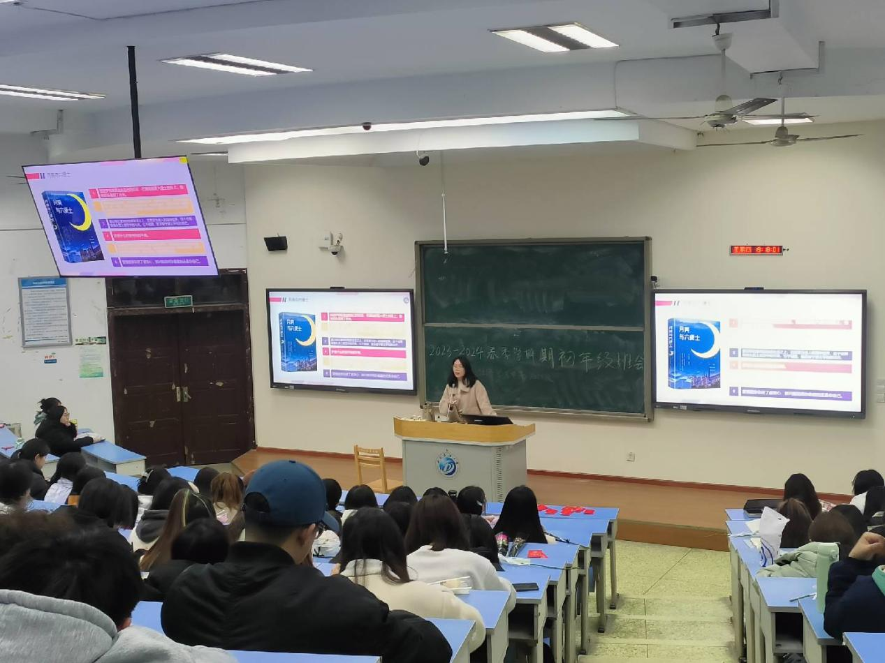 辅导员申成琳在会上详细总结了上学期班级在学分绩点、英语四六级、计算机二级等方面取得的成绩。她强调,这些成绩的取得离不开每一位同学的努力和奉献,也得益于班级良好的学习氛围,但也指出了大家在学习上还需要进步的地方。辅导员还特别提到了大家的假期生活,希望大家可以利用假期充实自己。另外在读书分享环节,辅导员就《我与地坛》分享了自己的读后感悟,并向大家推荐了《月亮与六便士》这本书,读书分享会不仅分享书本上的智慧,更交流心得体会,共同成长。