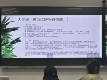 班长杨双宁以生动的语言介绍了近期“3.15”真实的消费维权案例,让同学们认识到了保护自身权益的必要性以及解决的合理途径。随后,通过知识问答的方式组织同学们展围绕自身消费维权经历展开激烈讨论,同学们纷纷发言,提出了许多具有针对性的问题。班长也耐心解答了同学们的疑问,并给出了实用性的建议。