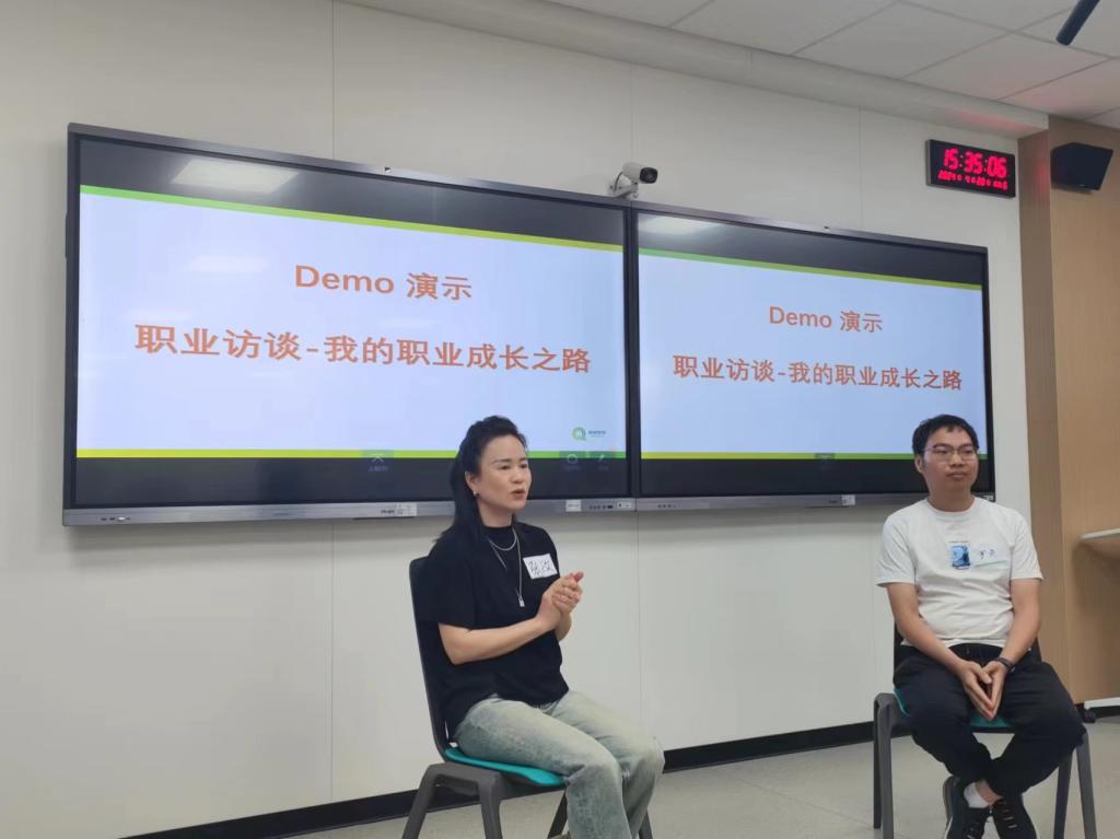 在职业访谈——我的职业成长之路的环节中,两位老师为同学做了范例,向同学展示了一位老师在自己求职生涯中的挫折、成长、成就以及未来他对自己职业的规划。同时老师们向同学展示了在面对挫折时,同学应该怎么办;以及在遇到挑战时,同学如何将成果做的最大化。通过此次的职业访谈,让同学感受到了在职业生涯中的挑战,提前为自己未来的职业规划打好了铺垫。
