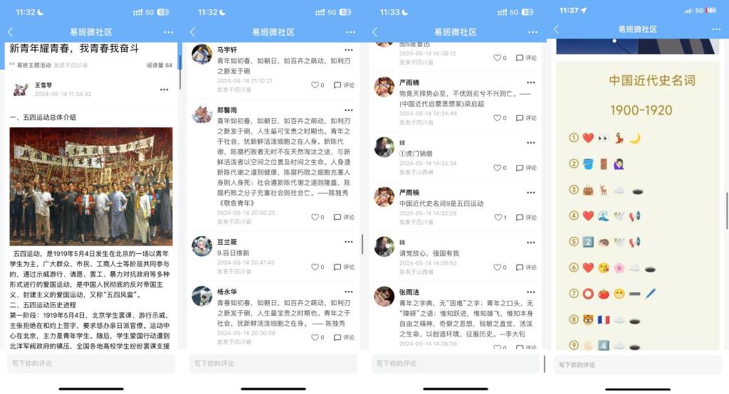 在易班平台上,我院23级经济学专业廖洪艳,在易班线上平台上发布了活动帖,让同学们回忆起了前辈们那段热血的青春。该帖子迅速引发了同学们的热烈反响,大家纷纷通过评论功能,积极分享了自己对于五四精神的理解与感悟。这些充满热情与活力的评论,不仅展现了同学们对五四精神的深刻认识,更折射出当代青年对于历史责任与时代担当的新思考。