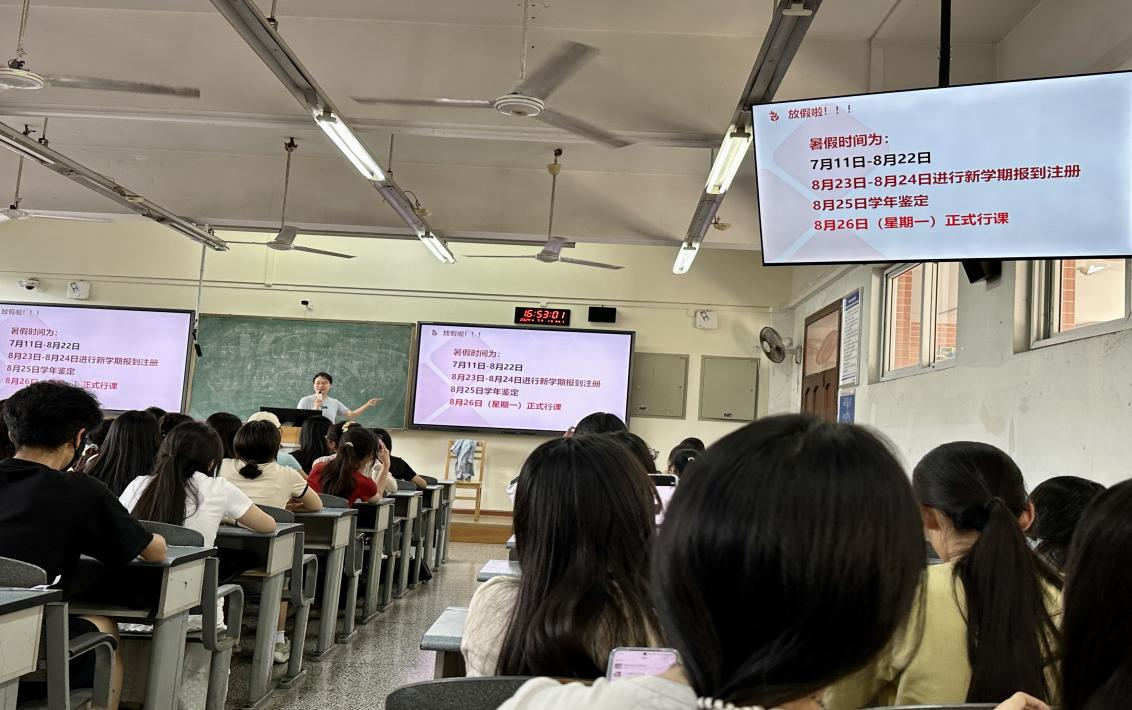 王娟向同学们讲解了暑假具体的放假时间、开学报到时间以及下学期开学后的主要工作学习安排,强调了放假期间安全问题。王娟以问题形式让同学们思考自己一年的收获:是否交到1-2个知心朋友,是否有过一次学生组织任职经历,是否以成年人的方式和父母好好沟通过一次,是否全程高质量的参与过一次学科竞赛……