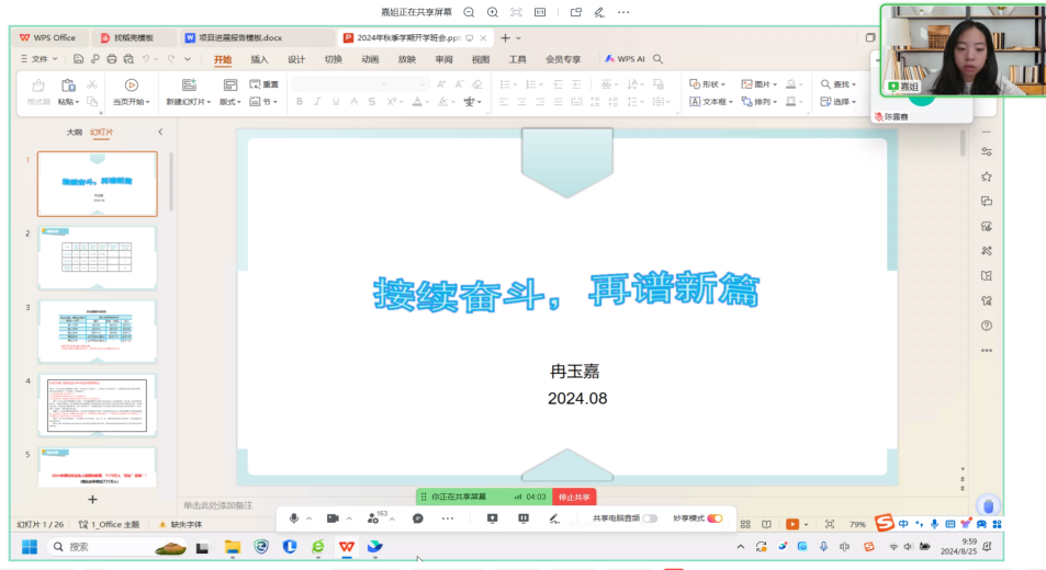 8月25日,2022级工商管理、市场营销、国际经济与贸易专业通过飞书视频会议召开新学期开学班会,本次班会以“接续奋斗、再谱新篇”为主题,班会由辅导员冉玉嘉主持,三个专业同学全体参与。