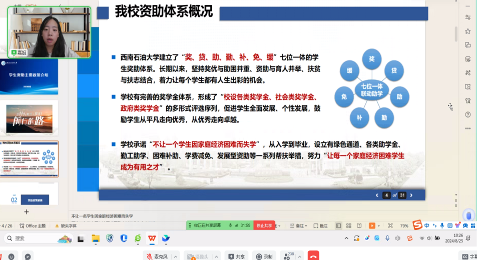 此外,冉玉嘉老师还认真详细地向同学们讲解各项奖助学金申请条件、申请时间、申请流程、申请标准和奖助金额以及诚信申报等事项,引导同学们在申报过程中做到实事求是。同时督促同学们认真阅读学生手册,了解学校相关规章制度并严格遵守学校各项规则,以及保护个人信息,维护网络环境的健康和谐。