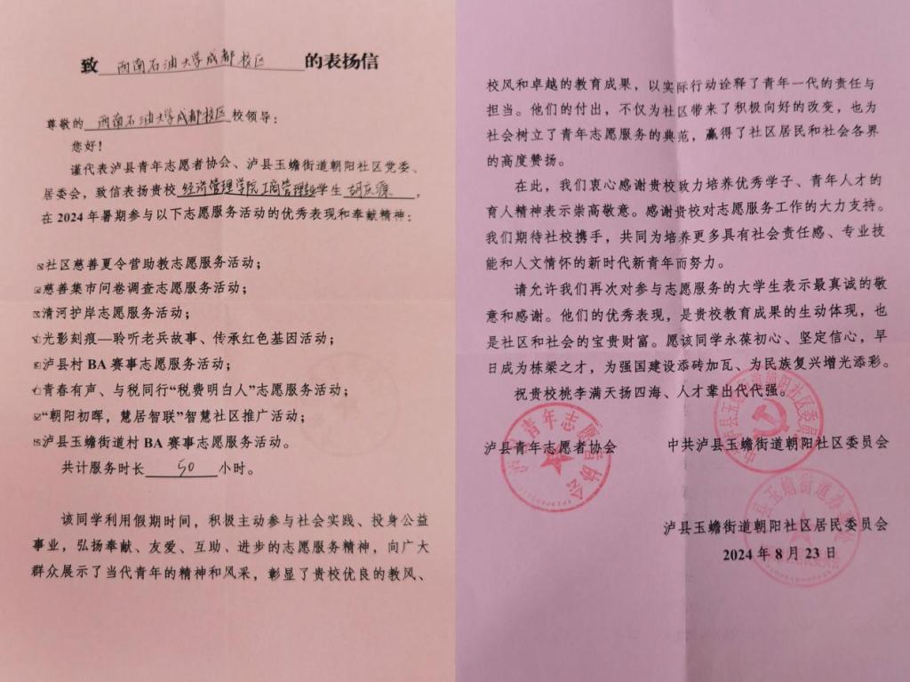 近日,泸县青年志愿者协会、泸县玉蟾街道朝阳社区党委、居委会,致信表扬我院工商管理专业学生胡庆源在2024年暑期参与志愿服务活动的优秀表现和奉献精神。