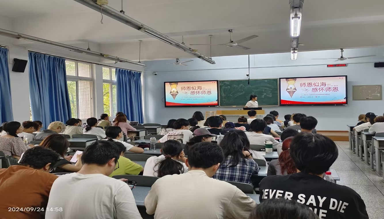 为深入贯彻落实党的二十届三中全会精神,弘扬尊师重教的优良传统,营造尊师重道的良好社会风气,培养学生的感恩之心,向敬爱的教师表达感激与崇敬之情,加强师生之间的沟通与交流,增强教师的光荣感、责任感和使命感。在第40个教师节来临的金秋时节,2023级国际经济与贸易2班同学于2024年9月24日下午在博学楼A206教室举办了“师恩似海,感怀恩师”主题班会。