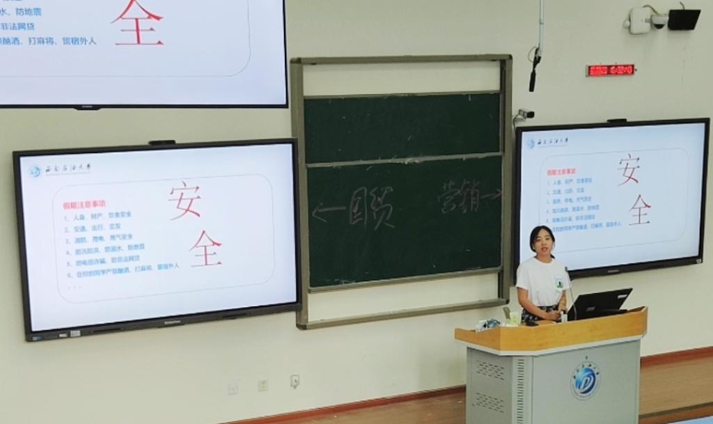 9月26日下午,国际经济与贸易、市场营销专业2022级在思学楼B110教室召开国庆节假期安全教育主题班会,本次班会由辅导员冉玉嘉主持,两个专业全体同学参与。