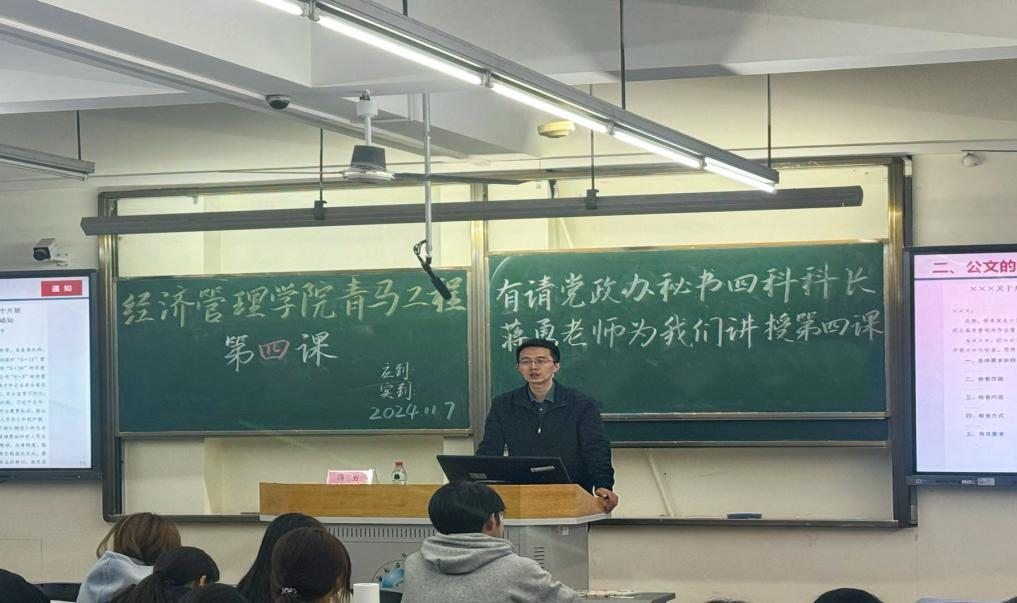 2024年11月7日晚,青马工程第四课在思学楼b409顺利举行。本次课程由党政办秘书四科科长蒋勇老师主讲,主题聚焦于公文写作与会务组织的关键技能与策略。青马工程全体学员积极参与,展现出极高的学习热情。