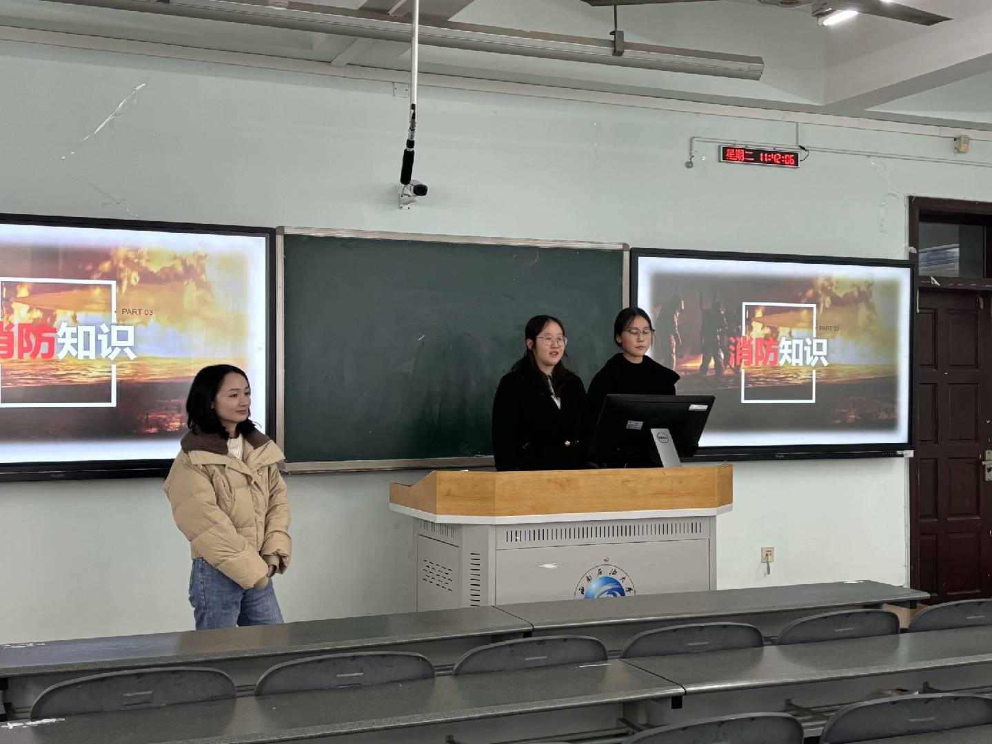 袁桔通过几例高校真实发生的火灾事件,对宿舍用电、消防安全等问题进行强调。视频科普主要介绍了各种情况下的火灾情况以及应对措施,以生动、直观的视频展示,让同学们认识到了火灾的危害性和破坏性。王语菲和赵欣雨两位同学现场向同学们进行了消防安全知识小科普,如各种消防标识、灭火器的使用方法、不同场合下的灭火方法等。班会最后进行了消防知识问答,通过现场提问,同学们积极参与回答,检测了同学们对消防安全知识的掌握程度。