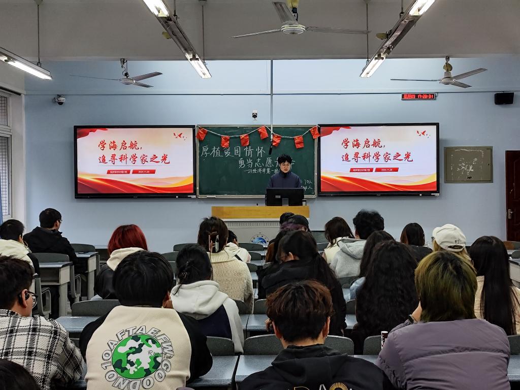 11月28日,23级经济学专业在博学楼A203展开了一场“学海启航,追寻科学家精神之光”主题班会,此次活动由辅导员王子昀老师主持。