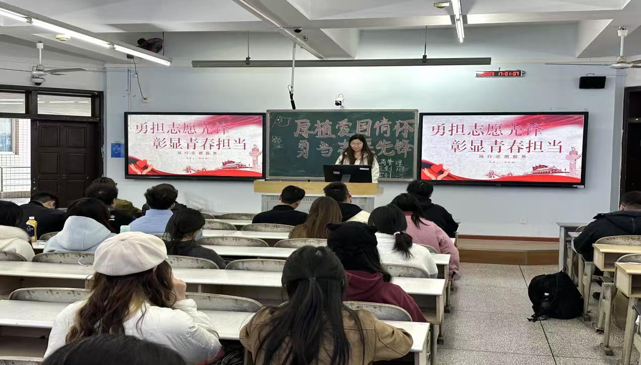 2024年11月28日,2023级工商管理专业在思学楼c206开展以“厚植爱国情怀,勇当志愿先锋”为主题的团组织生活。本次团组织生活由团支书刘佳欣主持,青志协部长刘昕迪进行宣讲。