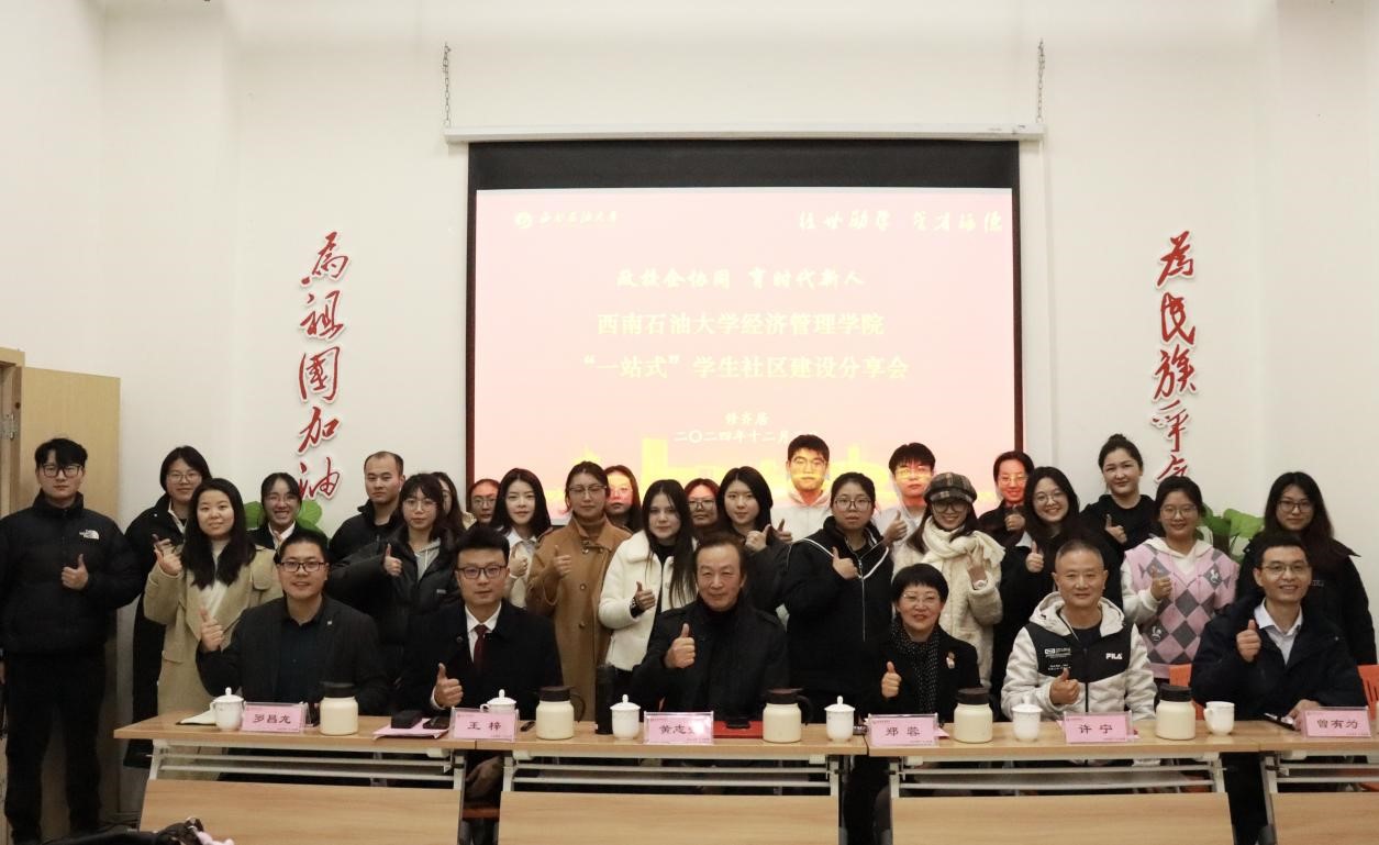 12月3日,经济管理学院举办“政企校协同 育时代新人”主题的“一站式”学生社区建设分享会。四川省人大民族宗教事务委员会副主任郑蓉,校党委副书记、工会主席衡彤,成都锦江商业联合会会长黄志强,成都市武侯区二级调研员许宁,成都市武侯区人民检察院综合业务部副主任王梓进行主题分享。学院党委书记曾有为主持。