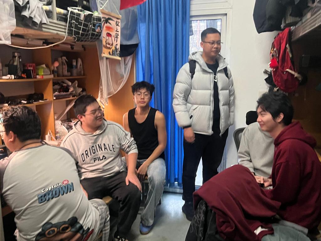 在走访过程中,郭玉博老师亲切地与每一位同学交谈,仔细询问了大家进入大学后的学习适应情况。对于部分同学提出的大学课程节奏快、学习难度增加的困惑,老师结合自身的教学经验,耐心地给予了学习方法上的指导。他建议同学们制定合理的学习计划,学会主动预习和复习,充分利用学校的图书馆资源拓展知识面,还鼓励同学们积极组成学习小组,相互交流、共同进步。在关注学习之余,他还将目光投向同学们的生活,细致入微地查看寝室的各个角落,从床铺的整理到书桌的摆放,对同学们良好的生活习惯予以肯定,并强调保持整洁有序的寝室环境对于身心健康和学习效率的重要性,鼓励大家继续维持。交谈中,郭老师深入了解同学们在饮食、作息等方面的情况。对于一些来自外地的同学,老师关切地询问他们是否适应本地的饮食口味,贴心推荐学校周边多样的美食选择,鼓励他们勇敢尝试新菜品,丰富味蕾体验。考虑到季节更替可能带来的健康问题,老师还特别提醒同学们要注意保暖,根据天气变化及时增减衣物,预防感冒等疾病。 老师不忘关心同学们的作息规律,了解到部分同学因参加社团活动或自主学习导致作息较晚时,老师分享了合理安排时间的小窍门,强调充足睡眠对学习和生活的积极影响,建议同学们尽量保持规律的作息时间,避免熬夜,以良好的精神状态迎接每天的学习与生活挑战。