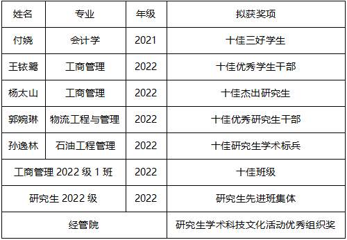 本次评选中,学院推荐的多个班级、学生组织和个人凭借优异的学习成绩、卓越的综合素质和突出的社会实践能力脱颖而出。在十佳先进集体评选中,我院班级凭借团结协作、积极进取的精神风貌和出色的集体成就,最终研究生2022级荣获“研究生先进班集体”称号,工商管理2022级1班荣获“十佳班级”称号。在十佳先进个人评选中,学院的付饶、王铱鹭、杨太山、郭婉琳、孙逸林等五名学生凭借其全面发展的个人素质、出色的学业成绩和精彩的表现力,全部荣获“十佳先进个人”称号。同时,学院荣获研究生学术科技文化活动优秀组织奖。