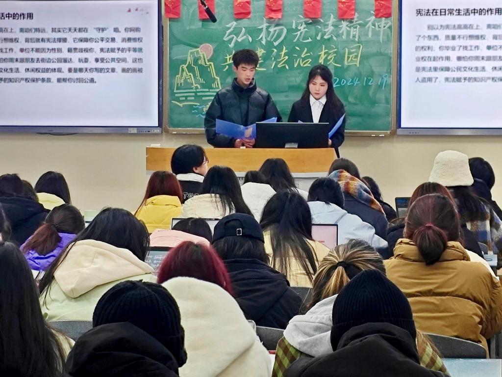为深入学习领悟贯彻习近平总书记的重要指示精神,推动法治精神在校园落地生根,12月19日晚,市场营销2024级在博学楼B302举办了“弘扬宪法精神,共建法治校园”主题班会。